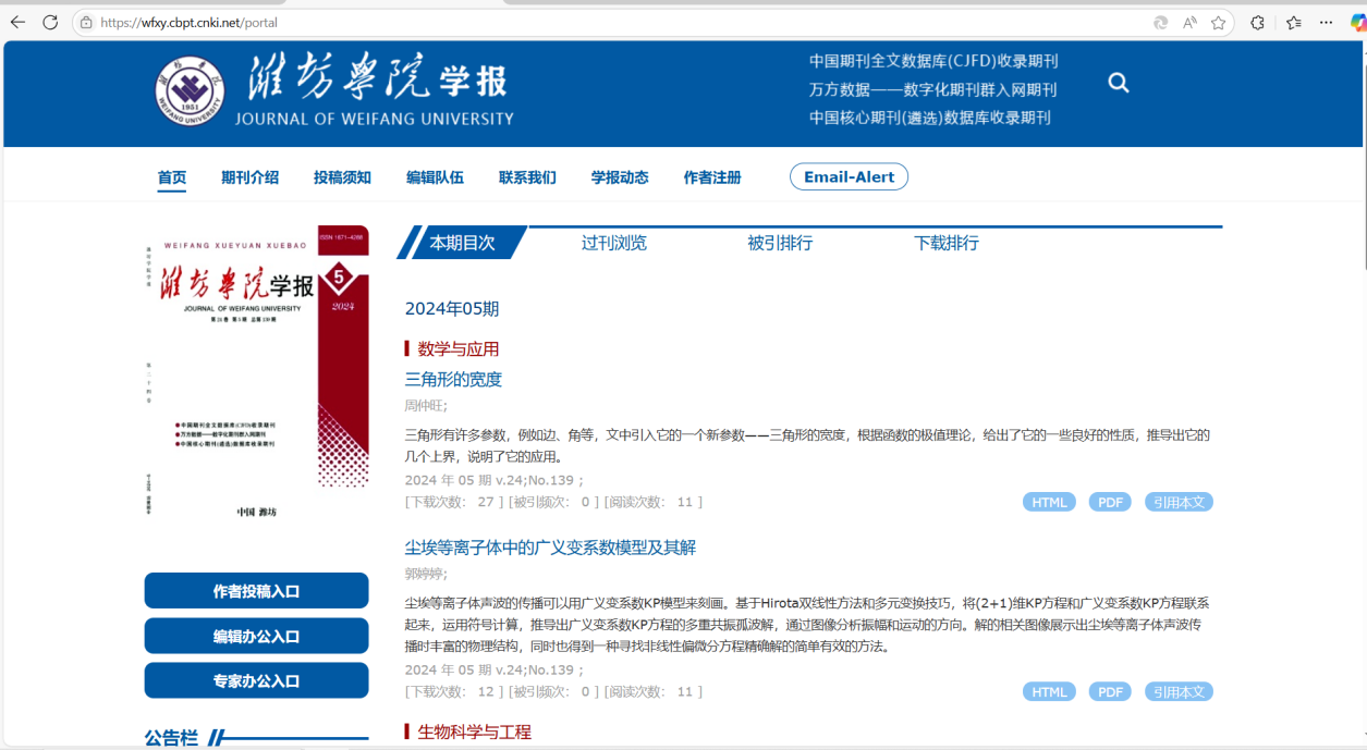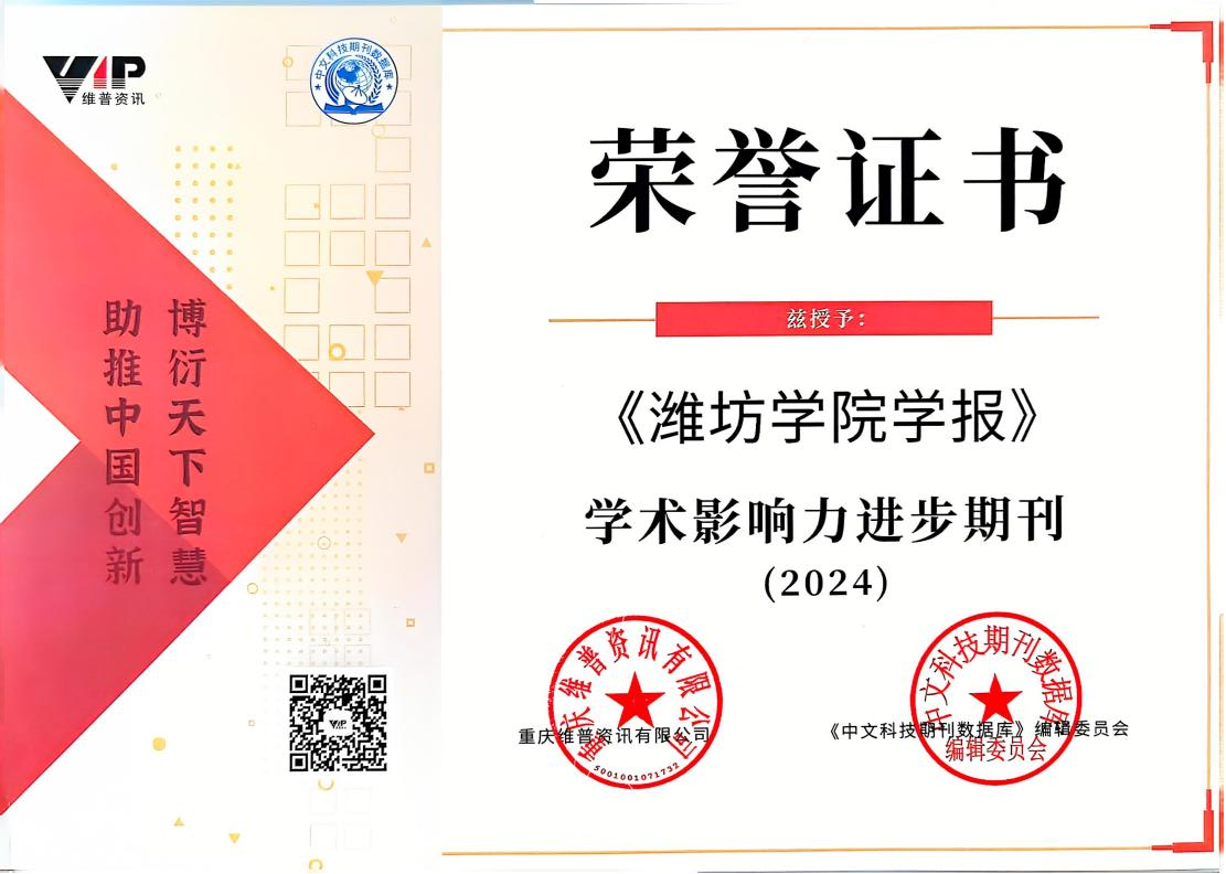 《潍坊学院学报》获评2024年度学术影响力进步期刊